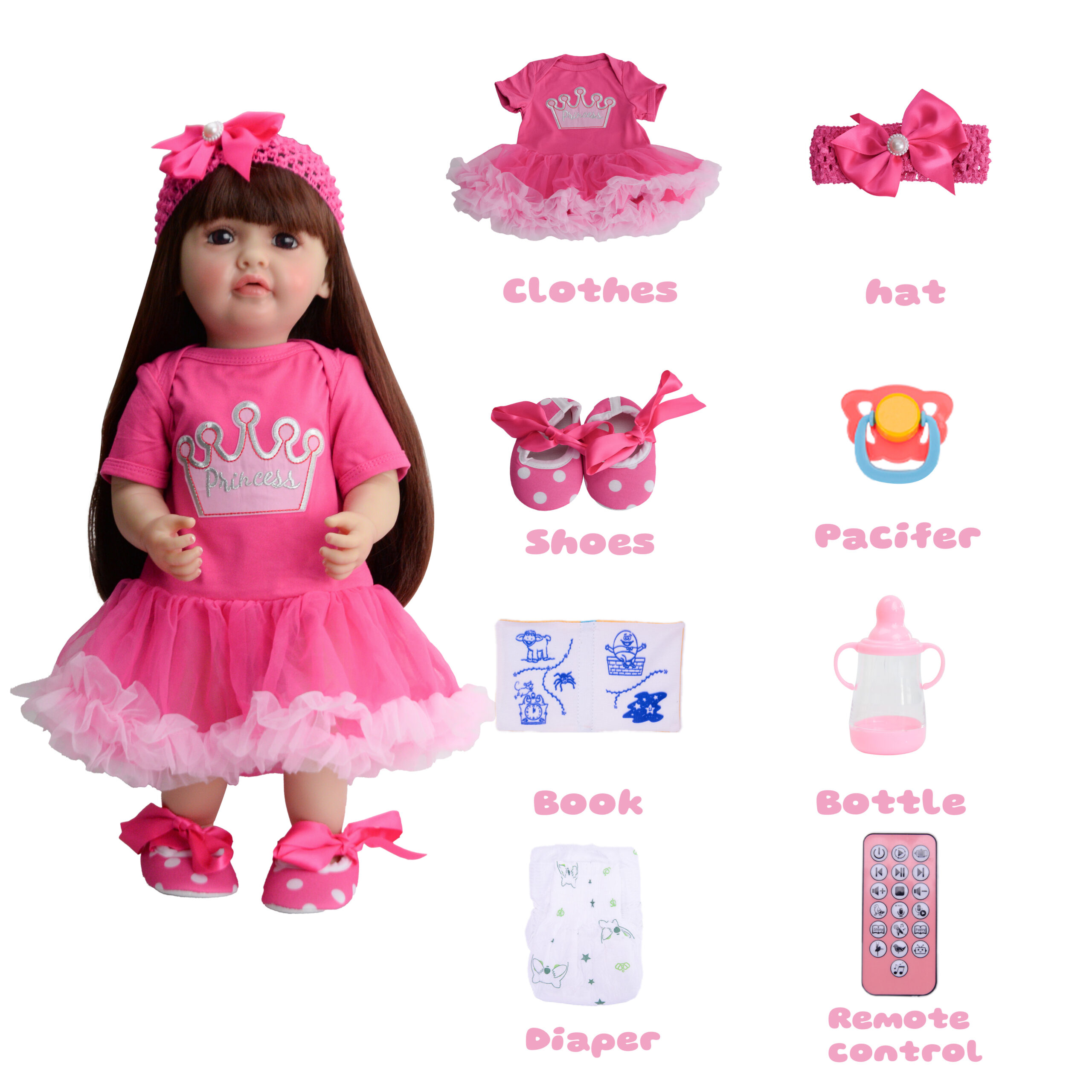 Accessories: Bottle, Diaper,Pacifier,books,birth certificate, color box.